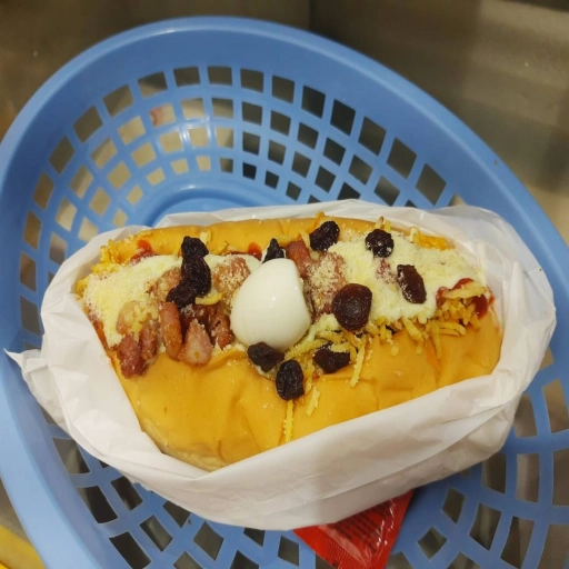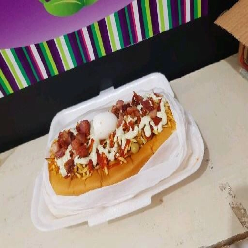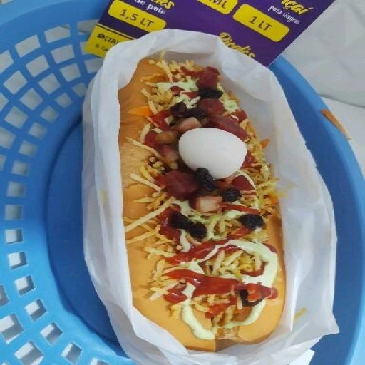 Pão, molho, 2salsicha, ervilha, milho, salpicão, parmesão, ralado, bacon, passas, batata palha, ovo de codorna maion... Ver completo