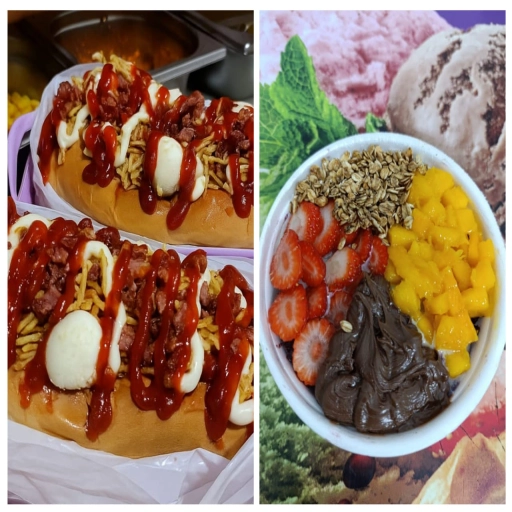 Açaí 500ml, escolha 2 coberturas, 4 complementos e 2 frutas. - Hot dog salsicha, ervilha. milho, passas, salpicão. ba... Ver completo